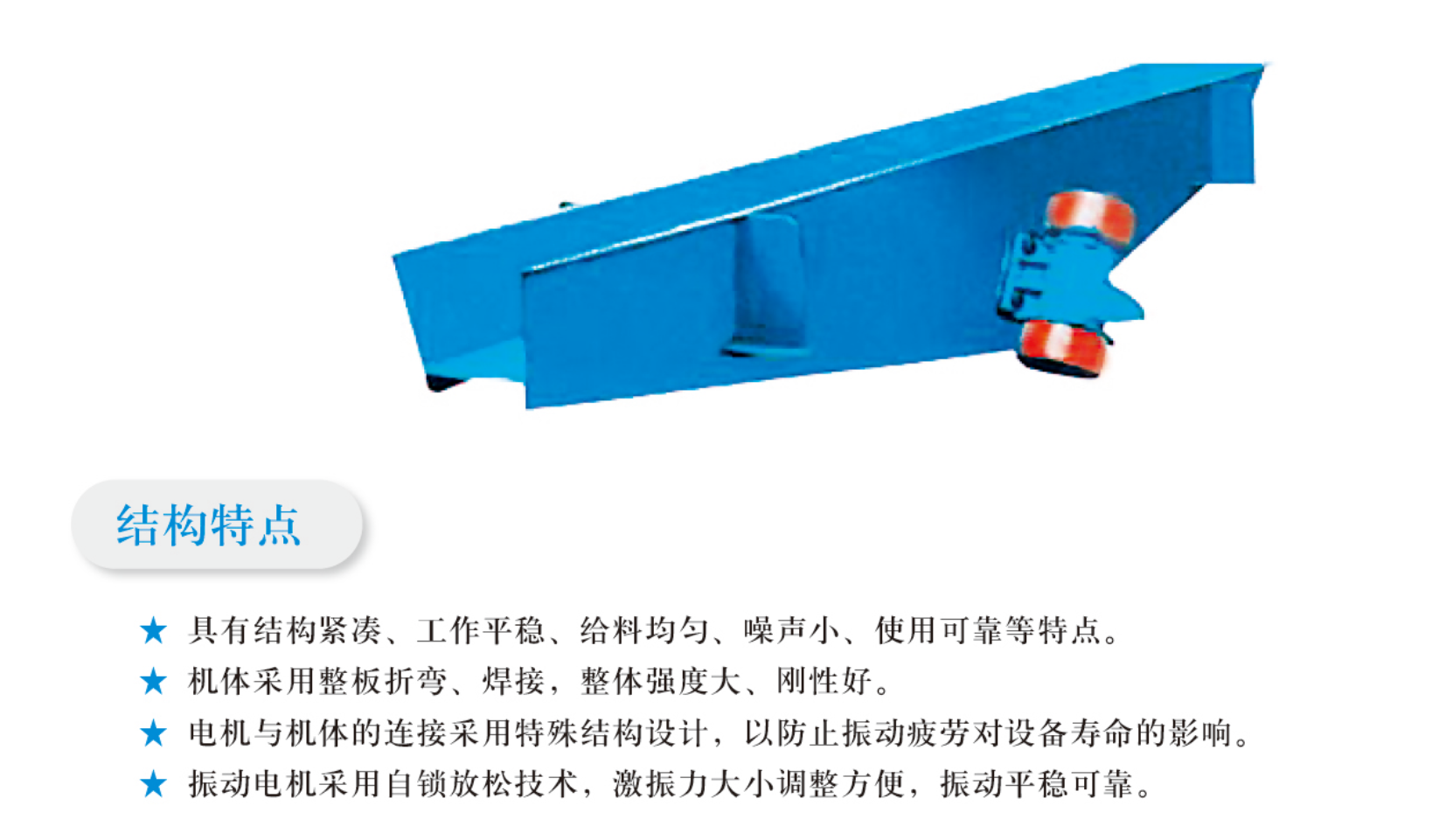 該機適用于塊、粒狀物料的輸送,在鑄造車間常與其它設備組成生產線用于焦炭、石灰石、新砂、舊砂的輸送。該機由兩個電機激振器同步反向旋轉,調整可調偏心塊,可改變激振力的大小,以適應不同生產率的需要。