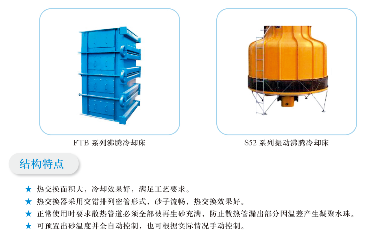 該機用于樹脂砂舊砂再生后砂溫調節(jié),采用循環(huán)水管式散熱的熱交換原理,達到使砂溫降低的目的。本機配備溫控系統(tǒng)和循環(huán)水系統(tǒng)。