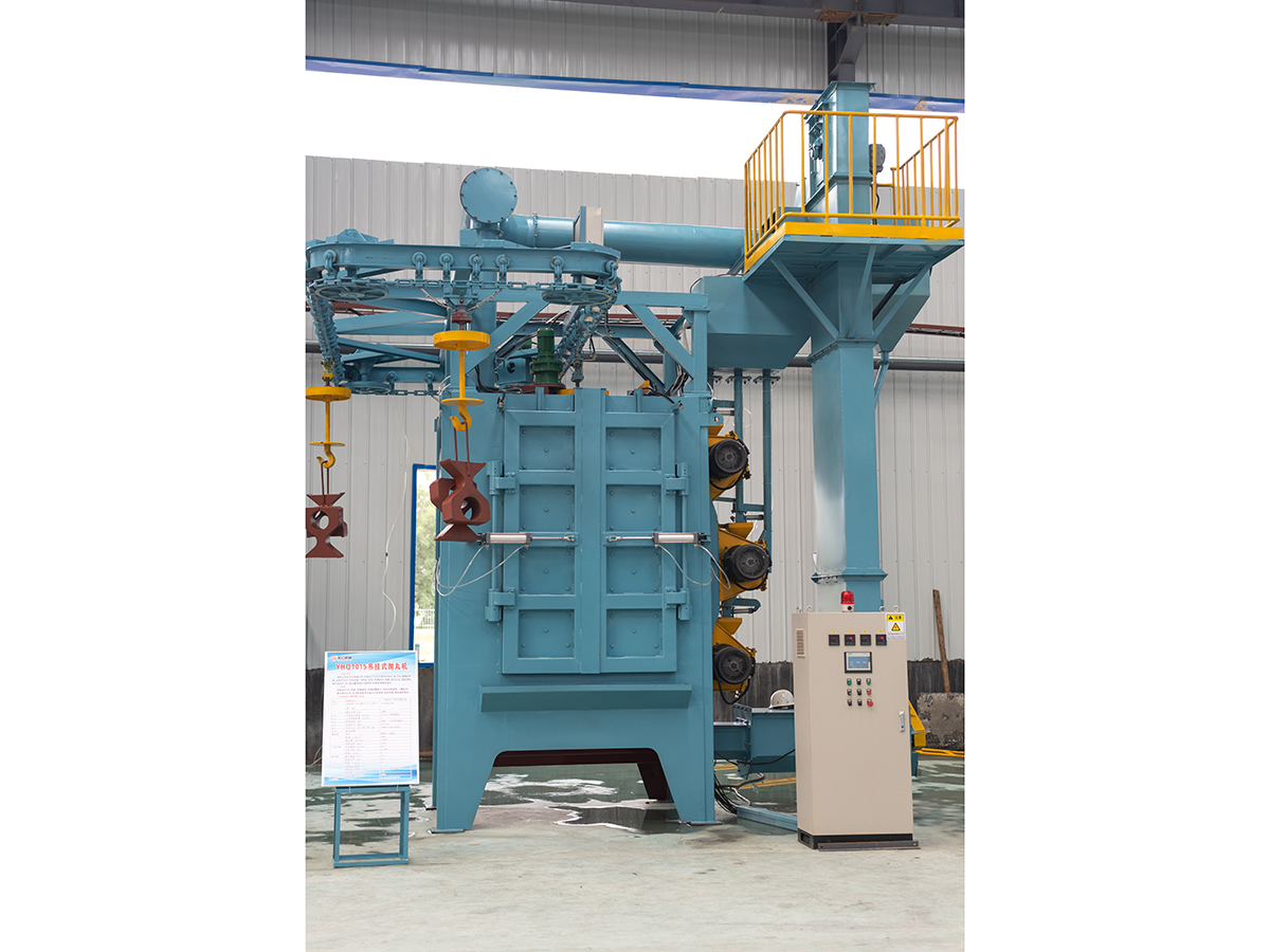 本公司自主開發的YHQ10系列環軌步進吊鏈式拋丸清理機。該機適用于大批量怕磕碰又不是特別大的工件的清理,生產效率極高。啟動后工人無需任何操作,只要掛上與取下工件即可,多個吊勾自動循環進入室內清理。
